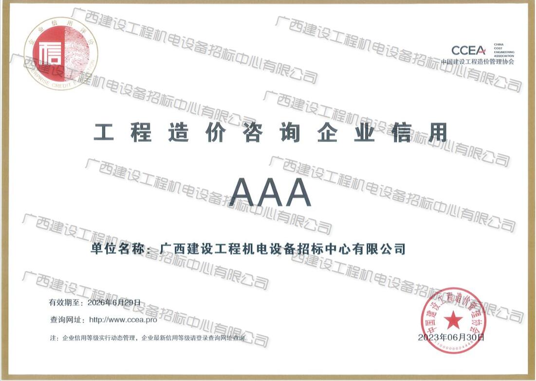 中國建設(shè)工程造價(jià)管理協(xié)會工程造價(jià)咨詢企業(yè)信用AAA等級