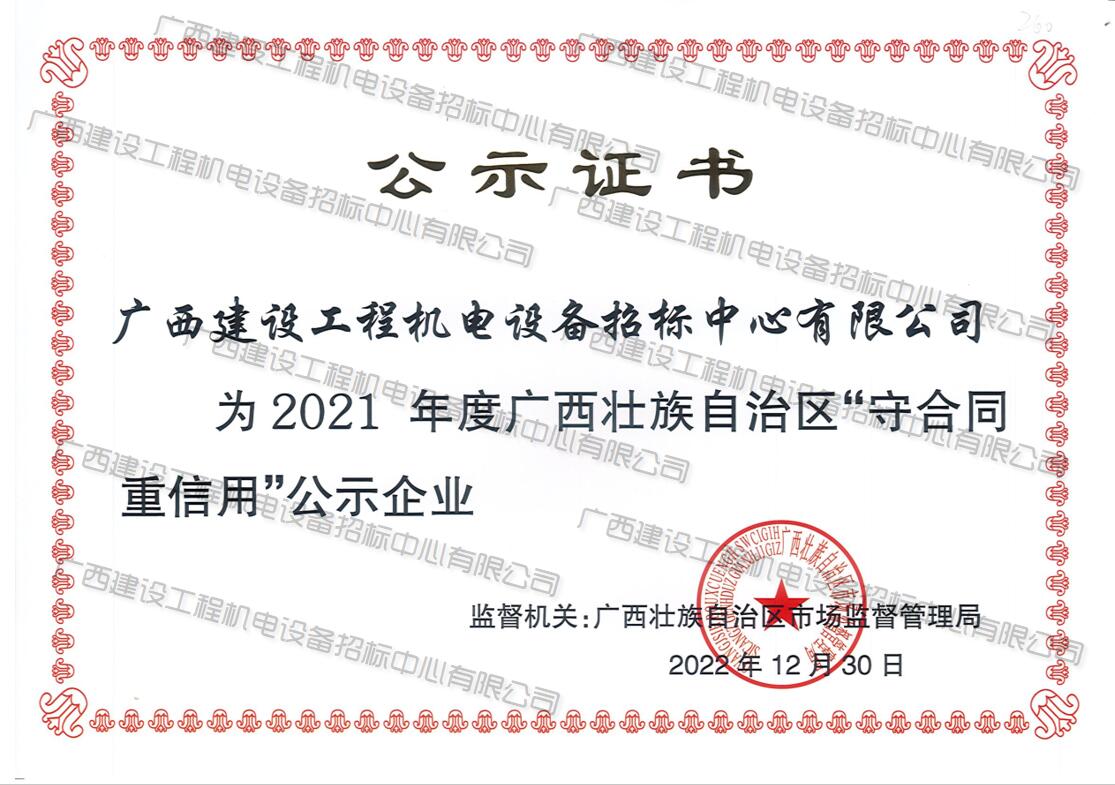 2021年度廣西壯族自治區(qū)“守合同重信用”企業(yè)公示證書